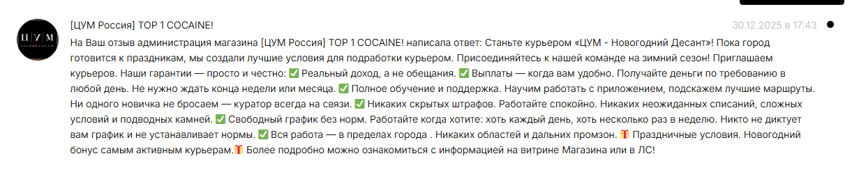 смотрю [ЦУМ Россия] TOP 1 COCAINE! выложили магнит по моему району, а у меня вообще глухо у нормальных магазов, ехать на такси через полгорода не кайф, отзывы хорошие, ну я взял двушку. смотрю еще позиция появилась новая 2г за 3650, типа пробы видимо. с других городов отзывы тоже хорошие, думаю возьму попробую хули. ну еще бошек взял и транков, чтобы сняться со всего этого дела. транки в центре, остальное у меня на районе. решил, естественно, все за раз взять(охуенная идея, знаю)
