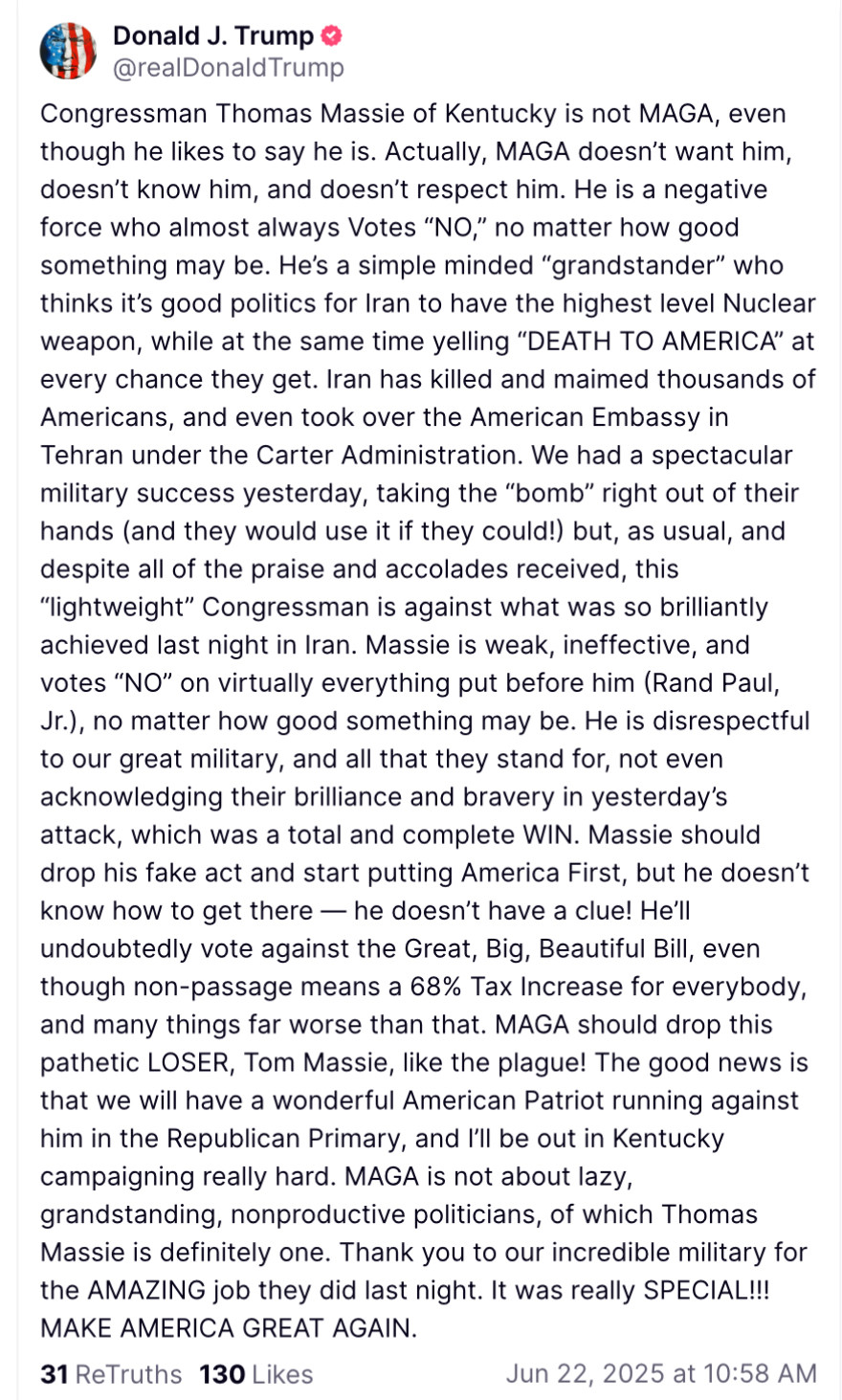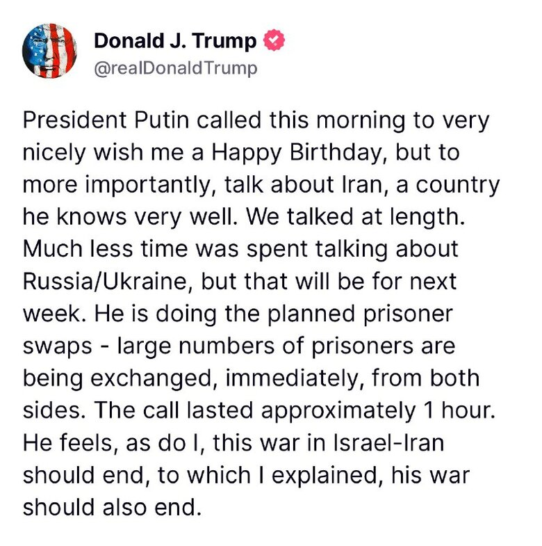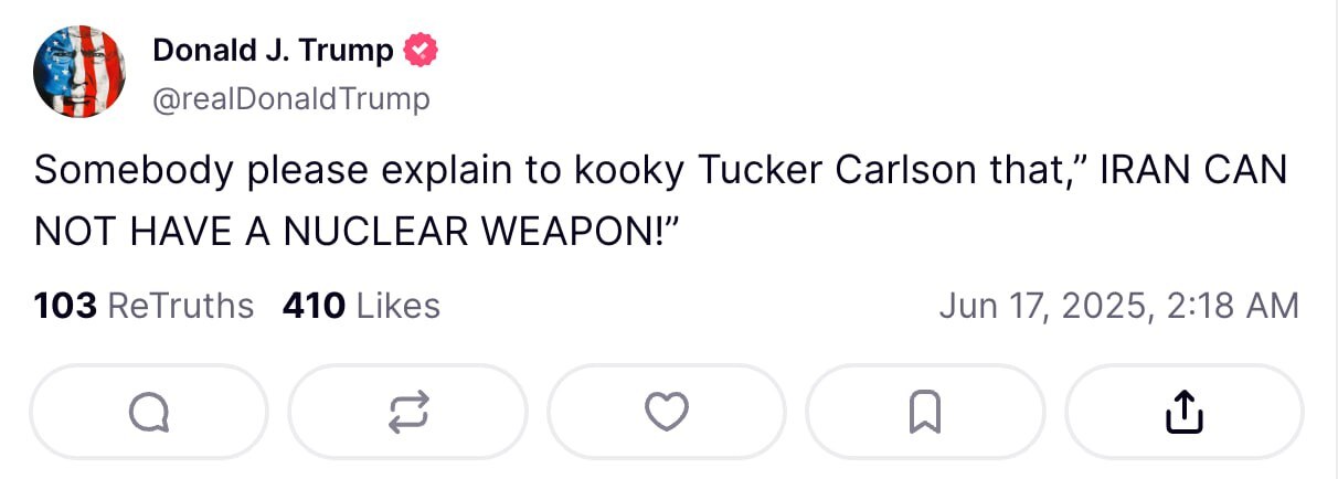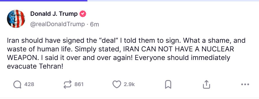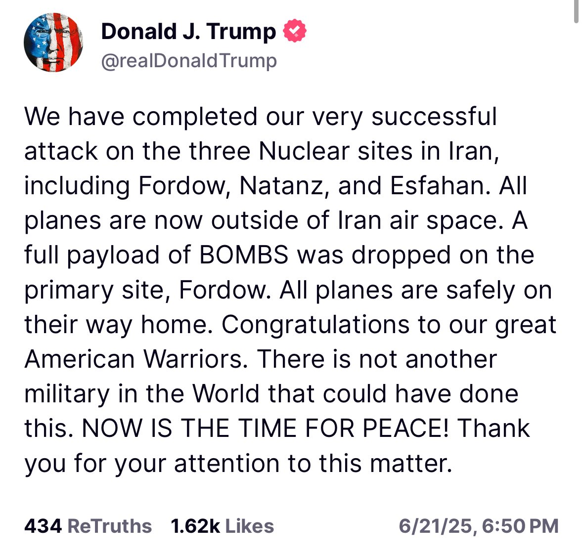 На своей странице в соцсети Truth Social Трамп опубликовал следующую запись: "Мы завершили нашу очень успешную атаку на три ядерных объекта в Иране, включая Фордо, Натанз и Исфахан. Все самолеты сейчас находятся за пределами воздушного пространства Ирана. Полный комплект БОМБ был сброшен на основной объект, Фордо. Все самолеты благополучно возвращаются домой. Поздравляем наших великих американских воинов. В мире нет других военных, которые могли бы сделать это. ТЕПЕРЬ НАСТАЛО ВРЕМЯ ДЛЯ МИРА! Спасибо за ваше внимание к этому вопросу".