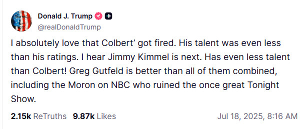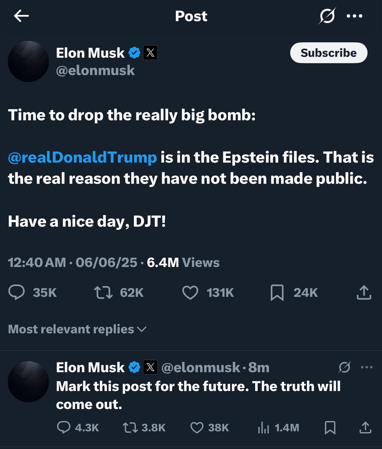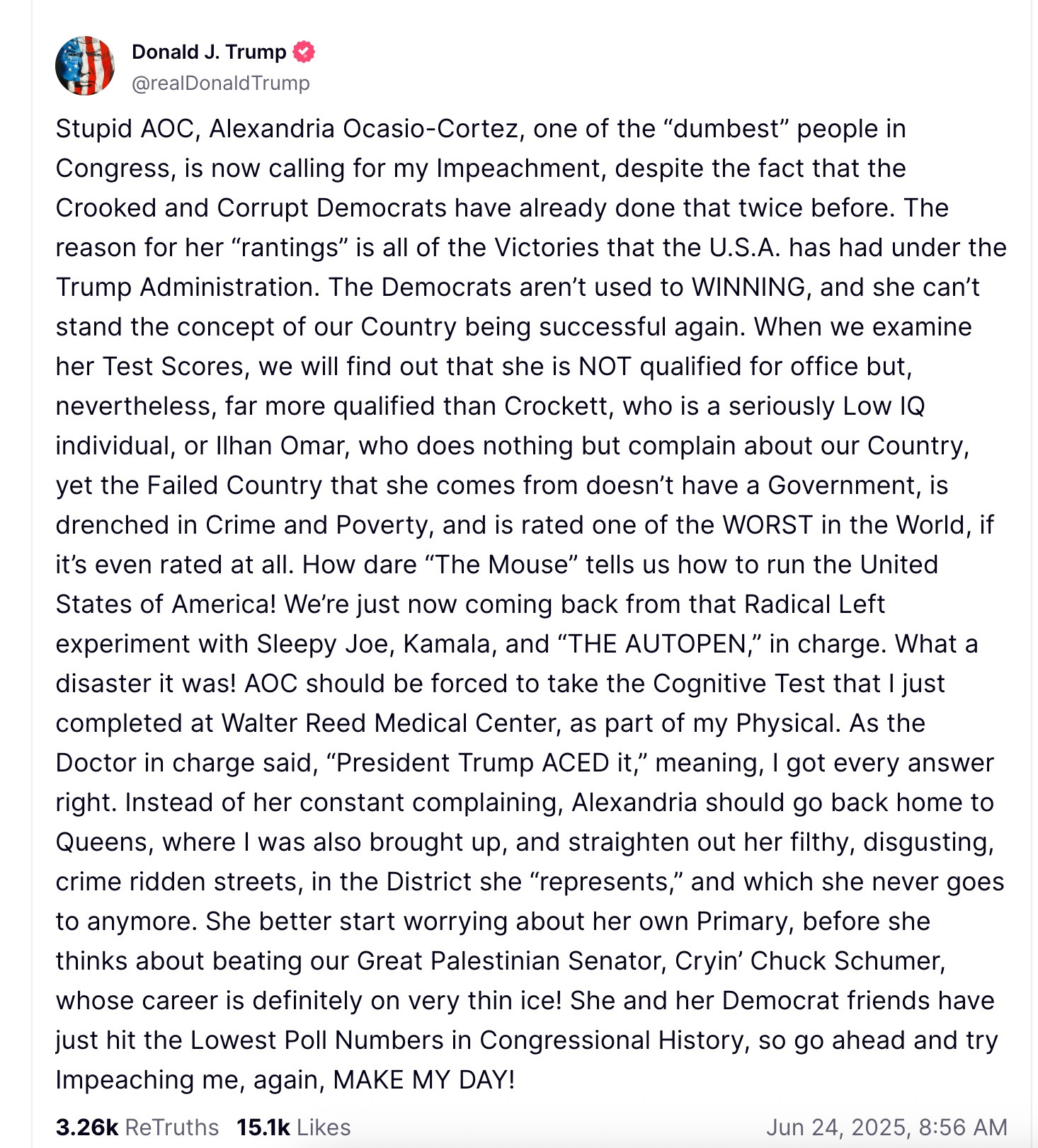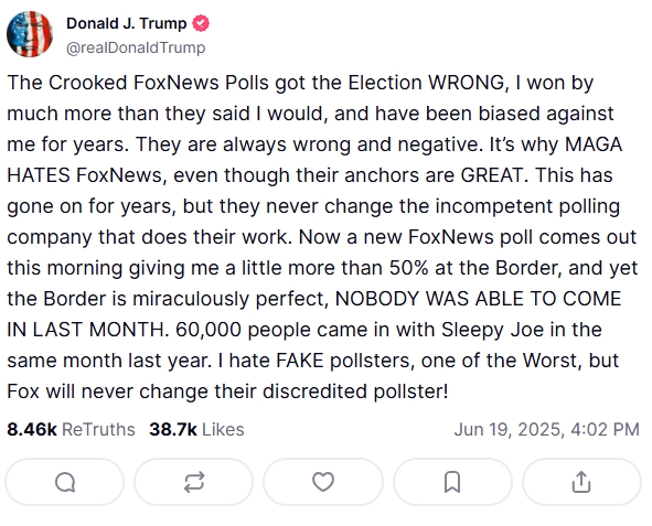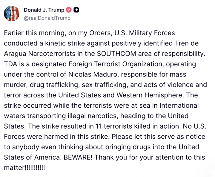 На своей странице в соцсети Truth Social Трамп опубликовал следующую запись: "Мы завершили нашу очень успешную атаку на три ядерных объекта в Иране, включая Фордо, Натанз и Исфахан. Все самолеты сейчас находятся за пределами воздушного пространства Ирана. Полный комплект БОМБ был сброшен на основной объект, Фордо. Все самолеты благополучно возвращаются домой. Поздравляем наших великих американских воинов. В мире нет других военных, которые могли бы сделать это. ТЕПЕРЬ НАСТАЛО ВРЕМЯ ДЛЯ МИРА! Спасибо за ваше внимание к этому вопросу".