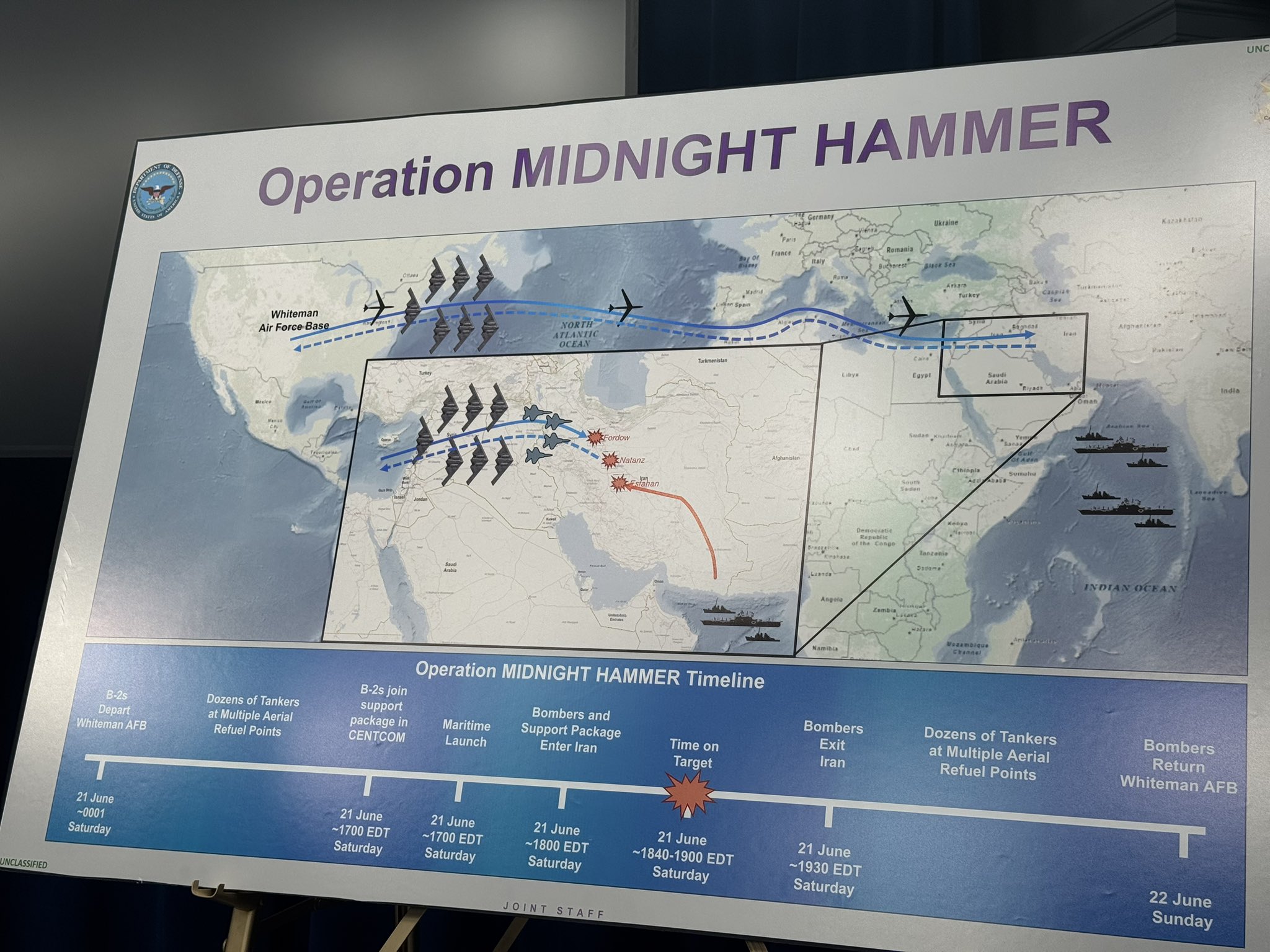 Американские источники сообщают: на ядерный объект в Фордо было сброшено в общей сложности шесть бомб GBU57, с подводной лодки было запущено 30 ракет "Томагавк" по ядерным объектам в Натанзе и Исфахане.